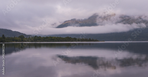 Fototapeta premium Scotland, UK Loch Lomond Mountains in mist with clouds