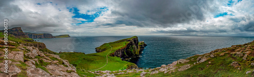 © Naeblys, Naklejka premium Scotland, United Kingdom: aerial view of the sheer cliff of Neist Point lighthouse (1909), famous promontory and viewpoint on the most westerly point on the Duirinish peninsula on the Isle of Skye