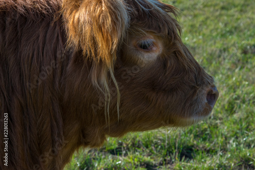 Fototapeta premium Scottish mountain bull head in profile close-up.