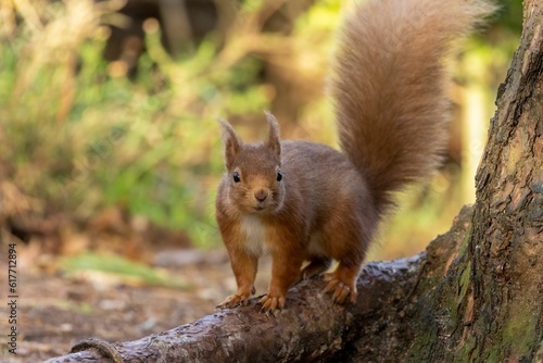 Fototapeta premium Scottish red squirrel atop a wooden tree branch in a lush, green forest