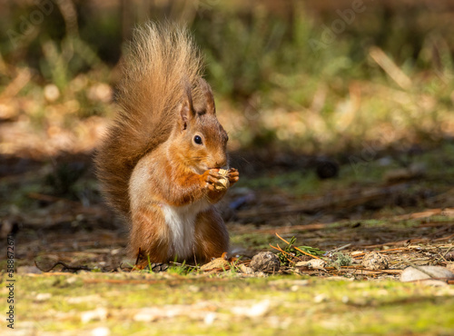 Obraz premium Scottish red squirrel eating a nut in the sunshine on the forest floor