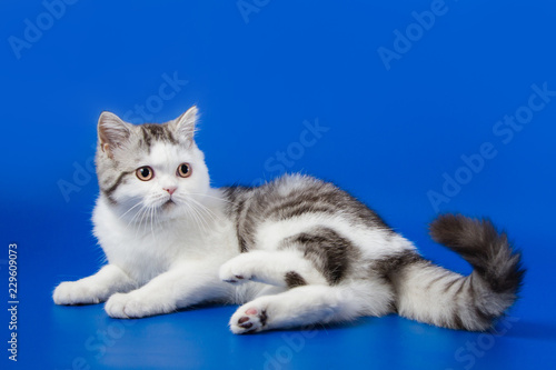 Obraz premium Scottish Straight kitten lying on blue background