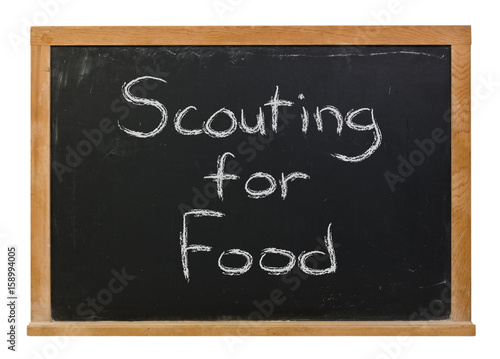 © clsdesign, Obraz premium Scouting for food written in white chalk on a black chalkboard isolated on white