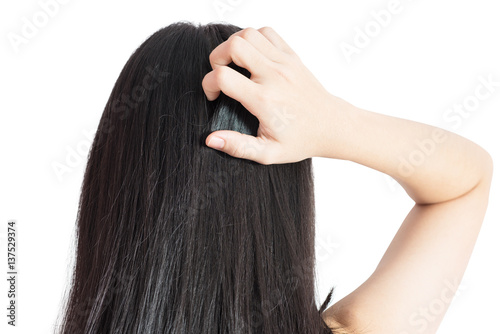 © chatchai, Naklejka premium Scratching her head in a woman isolated on white background. Clipping path on white background.