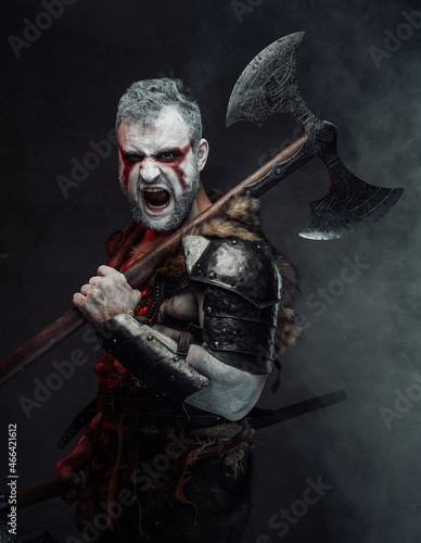 © Fxquadro, Naklejka premium Screaming mythical warrior with painted skin and axe in studio