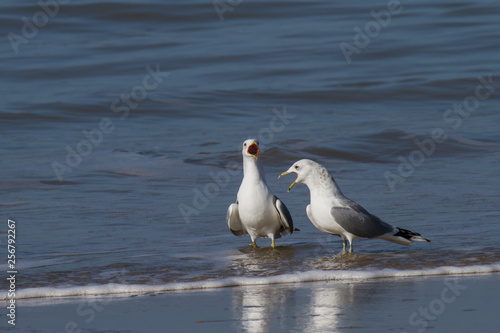 © jokuephotography, Fototapeta premium screaming seagulls in flat water on the beach