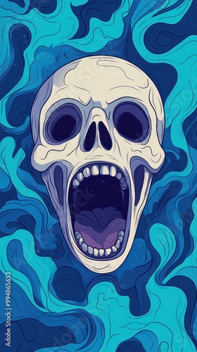 Fototapeta premium Screaming skull design with vibrant blue swirls, dramatic art style.