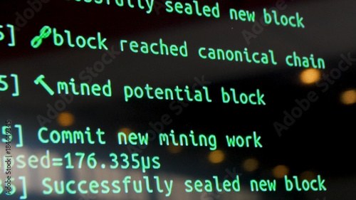 © Media Whale Stock, Obraz premium Screen with crypto code, green digitals. Programm code for mining cryptocurrency, mining work. Screen with software developer code. Crypto-currency