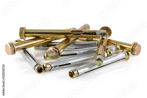 © bm_photo, Naklejka premium Screw-bolt metallic anchors with yellow zinc coating for concrete. , Expansion Anchor, Concrete anchor bolt. Close-up.