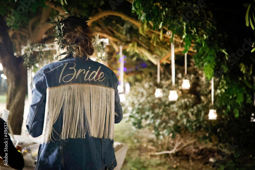 © alex.pin, Naklejka premium scritta bride su una giacca in jeans indossata da un afutura sposa