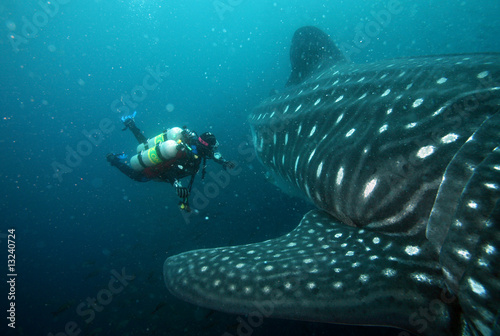 © Arvydas Kniukšta, Fototapeta premium scuba diver approaching whale shark in galapagos islands