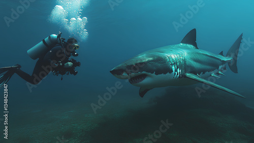 Fototapeta premium Scuba Diver Encounters Great White Shark