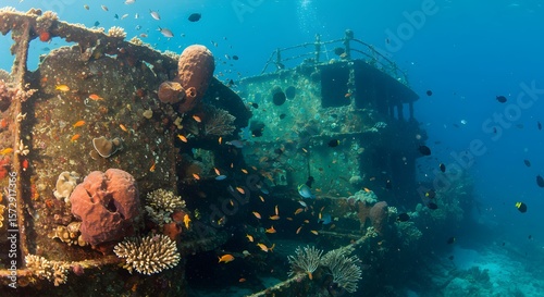 © IrmaPrastiwi, Fototapeta premium Scuba diver exploring an ancient shipwreck covered in vibrant coral reefs and marine life