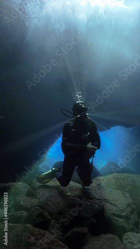 © Johan, Fototapeta premium Scuba diver in glacier cave