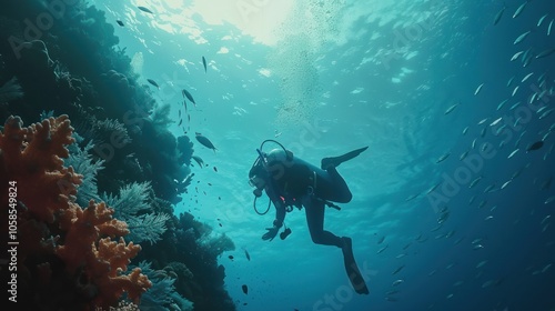 © Mas, Fototapeta premium Scuba diver in tropical sea marine coral reef underwater, AI generated image