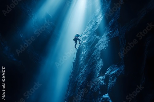 © Chumporn, Fototapeta premium Scuba Diver Silhouette Exploring Underwater Cave in Aqua Blue Light