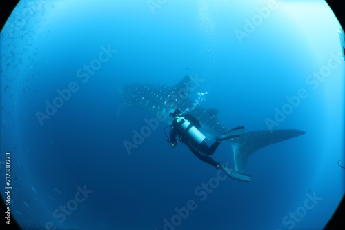 © Lindsey, Naklejka premium SCUBA diver with giant female whale shark in Darwin Island in the Galapagos Islands