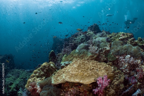 Fototapeta premium Scuba divers explore a vibrant coral reef teeming with marine life.