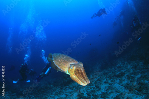 © Richard Carey, Obraz premium Scuba divers explore coral reef and fish