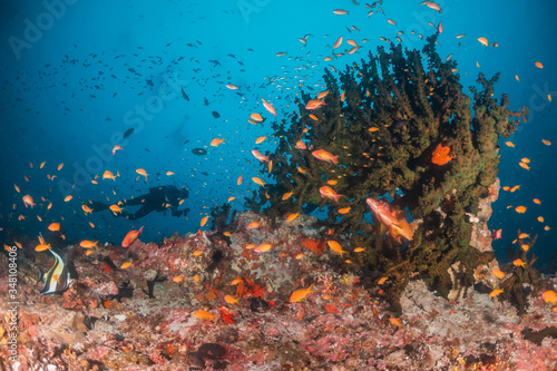 © Aaron, Naklejka premium Scuba divers swimming over a colorful coral reef surrounded with fish