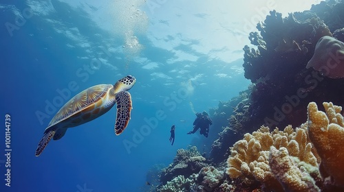 Fototapeta premium Scuba Diving with Turtles in Coral Reef Environment