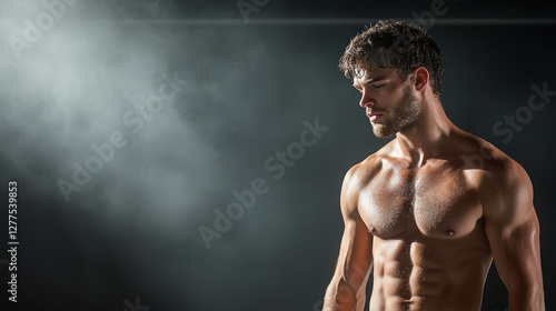 Fototapeta premium Sculpted physique of handsome man with six pack abs in moody setting
