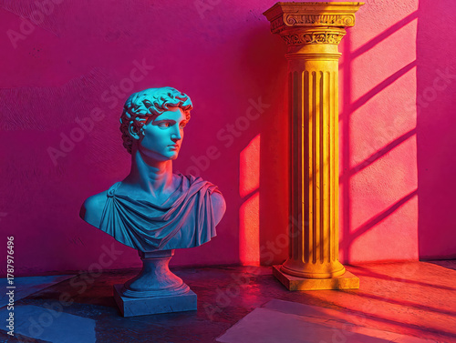 © Photocreo Bednarek, Fototapeta premium Sculpted plaster bust casting long shadows, dramatically lit by contrasting blue orange lights against pastel pink wall