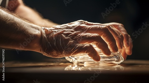 © javier, Fototapeta premium Sculptor adds finishing touches to glass sculpture translucent beauty under warm light
