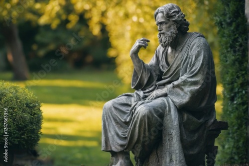 Fototapeta premium Sculpture of a contemplative man in a serene garden setting, made of stone...