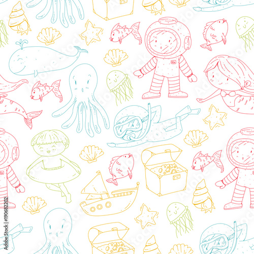 Fototapeta premium Sea and ocean adventure Kindergarten, preschool, school children. Kids...