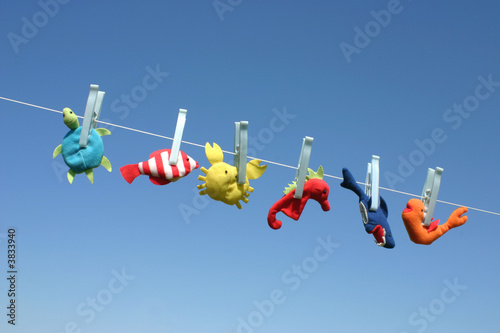 © BOOCYS, Fototapeta premium Sea animal toys hanging on the laundry wire and drying