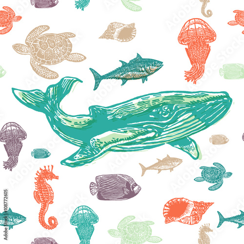 Fototapeta premium Sea animals colorful seamless vector pattern.