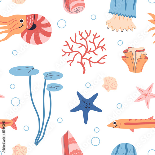 © tanyabosyk, Naklejka premium Sea animals, fish, whale, jellyfish, shell, coral and seaweed, crab, starfish. Seamless pattern of hand drawn sea life creatures and elements. Vector doodle cartoon set of marine life objects.