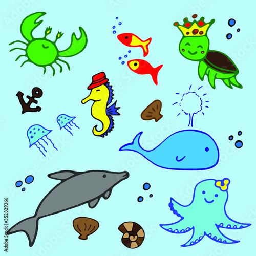 Fototapeta premium Sea animals vector set. Sea life cartoon set.