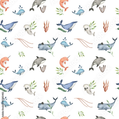 © Bianca, Fototapeta premium Sea animals whale watercolor illustration pattern