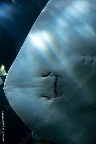 Fototapeta premium Sea aquarium with salt water and differenet colorful coral reef fish and Batoidea ray