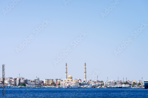 © YuliiaMazurkevych, Fototapeta premium Sea bay with parked speed boats near Hurghada Mosque.