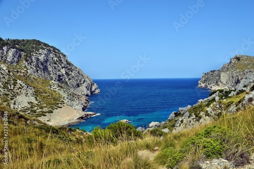 Fototapeta premium Sea bay with turquoise water, beach and mountains, Cala Figuera on Cap Formentor
