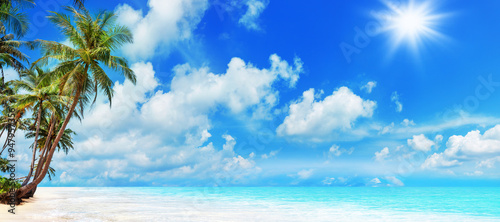 © Vera Shestak, Fototapeta premium Sea beach, paradise tropical island, beautiful nature panorama landscape, turquoise ocean water, coconut palm trees, white sand, summer holidays, vacation, travel banner, Caribbean, Maldives, Thailand