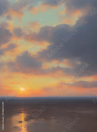 Obraz premium sea, beach, sunset view with dramatic clouds, digital illustration