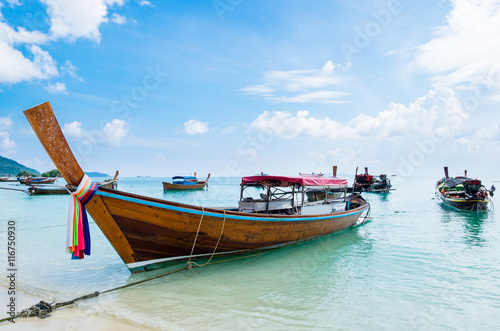 Obraz premium Sea beach with group long tail boat anchor coast at lipe island