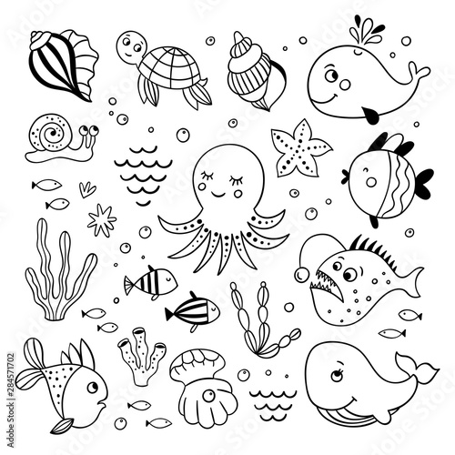 © redchocolatte, Naklejka premium Sea creatures and underwater animals vector illustrations. Hand drawn fishes, octopus, turtle, sea shells, plants