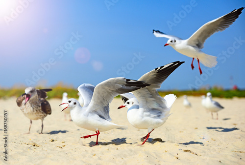 © nndanko, Fototapeta premium Sea gulls walk and wave their wings