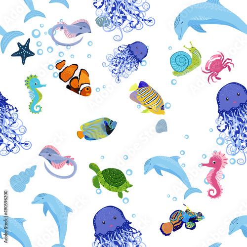 Naklejka premium Sea inhabitants seamless pattern, beautiful character among seashells, seaweed, starfish, sea animals wildlife
