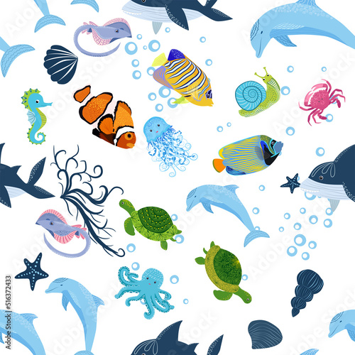 Naklejka premium Sea inhabitants seamless pattern, beautiful character among seashells, seaweed, starfish, sea animals wildlife