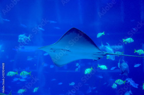 Fototapeta premium Sea life, a stingray swimming in clear water with variety of sea fishes in background