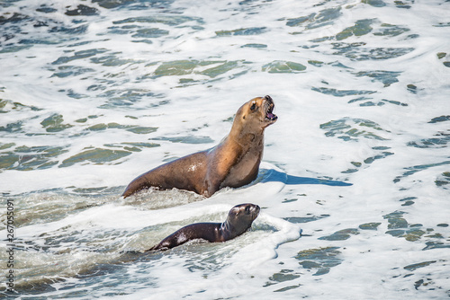 Fototapeta premium Sea lion mother and her calf learning to swim at Peninsula Valdes, Punta Norte, Patagonia, Argentina