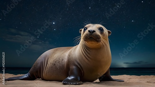 © Sokimimi Studio, Fototapeta premium Sea Lion Pup on Beach at Night Under Stars