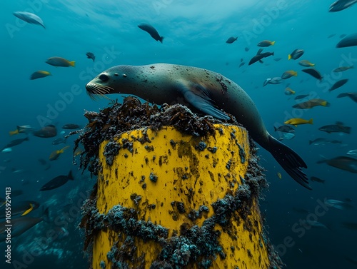 © DesignByGade, Obraz premium Sea lion resting on a buoy in the ocean.
