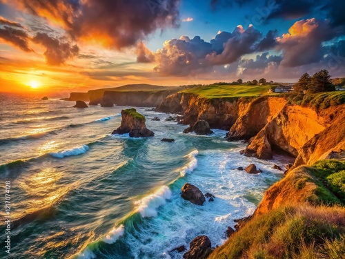 Obraz premium Sea Ranch California Coastal Sunset: Dramatic Pacific Ocean Cliffs & Golden...